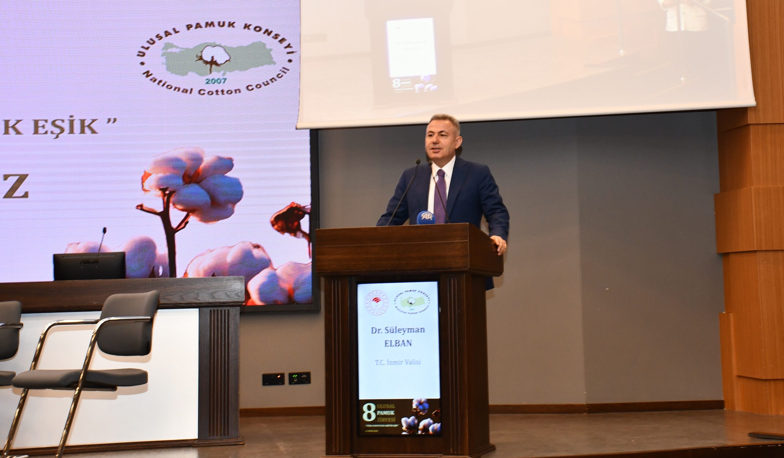 T.C. İzmir Valisi Dr. Süleyman Elban da konuşmasında üretim maliyetlerinin düşürülmesine yönelik çalışmaların önemine değinerek, özellikle sulama tekniklerinin geliştirilmesi gerektiğini vurguladı. Bilinçsiz kimyasal ve ilaç kullanımının maliyetleri artırdığına dikkat çeken Elban, bu durumun bazı bölgelerde tarımdan uzaklaşmaya neden olduğunu ifade etti. Çiftçilerin pamuk üretiminden kopuş hızının azaltılması gerektiğini belirten Elban, sektör temsilcilerinin hızlı ve somut çözüm önerilerine odaklanmasının önemine işaret etti.